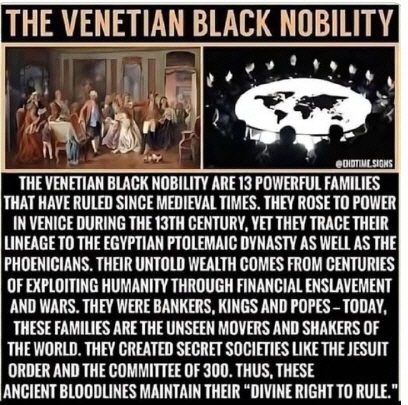 https://sembrouthes.wordpress.com/the-venetian-black-nobility-a-history/who-are-the-black-nobility/ "Der „Schwarze Adel“ sind/waren die oligarchischen Familien von Venedig und Genua, Italien, die im 12. Jahrhundert die privilegierten Handelsrechte (Monopole) besaßen. Der erste von drei Kreuzzügen, von 1063 bis 1123, etablierte die Macht des venezianischen Schwarzen Adels und festigte die Macht der wohlhabenden herrschenden Klasse. Die Aristokratie des Schwarzen Adels erlangte 1171 die vollständige Kontrolle über Venedig, als die Ernennung des Dogen auf den sogenannten Großen Rat übertragen wurde, der aus Mitgliedern der Handelsaristokratie bestand (darunter die berüchtigte Familie de’Medici). Venedig ist seitdem in ihren Händen geblieben, aber die Macht und der Einfluss des venezianischen Schwarzen Adels reichen weit über seine Grenzen hinaus und sind heute in jedem Winkel des Planeten zu spüren. (Vergessen Sie nicht, unser modernes Bankensystem hat seinen Ursprung in Italien.)